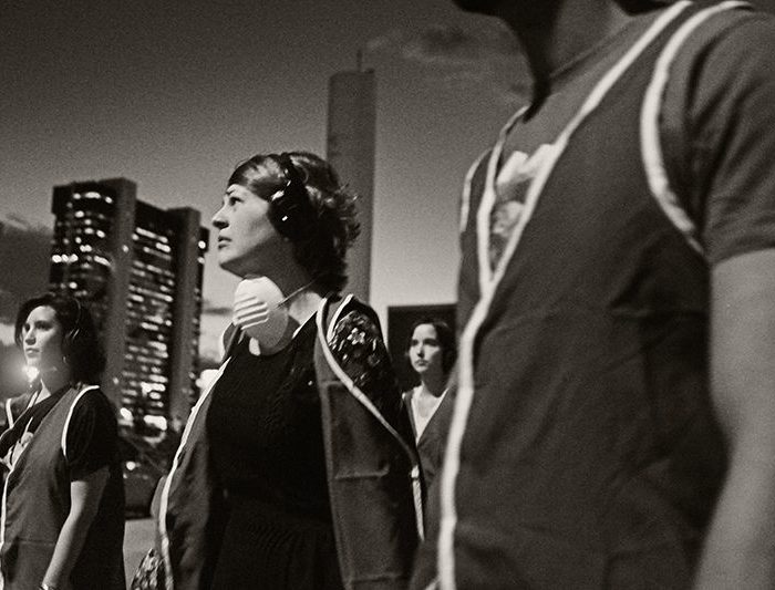 Description : “Et si le domaine public était un plateau de jeu à taille humaine ? Munis de casques audio, les spectateurs participent à une scénographie étonnante : répondre à une série de questions posées par un instructeur, en se déplaçant sur l’aire de jeu ou en faisant un geste précis.”